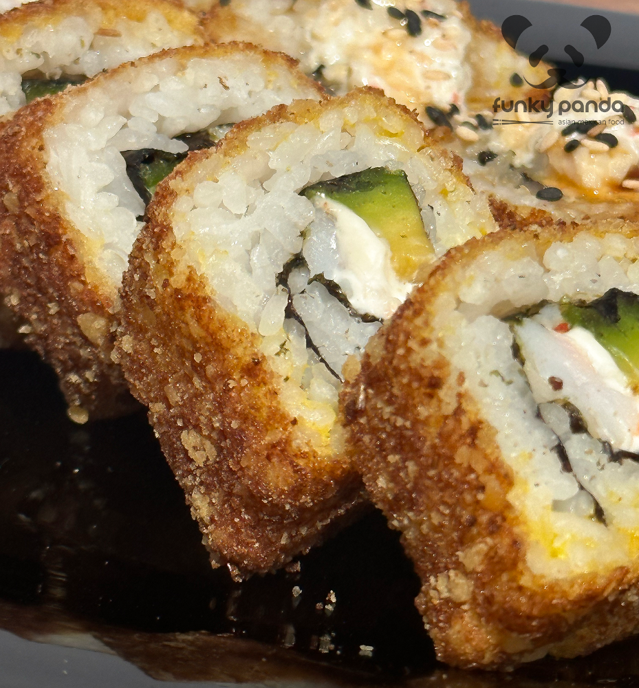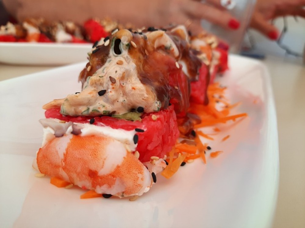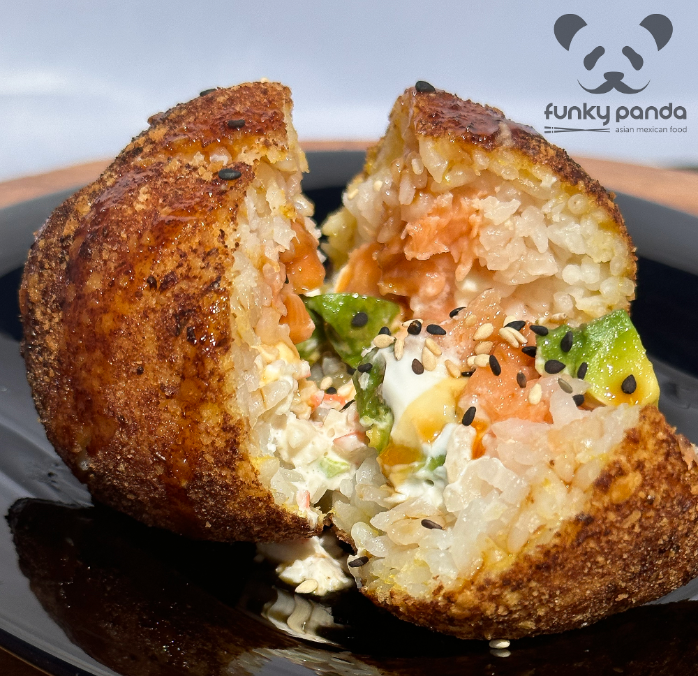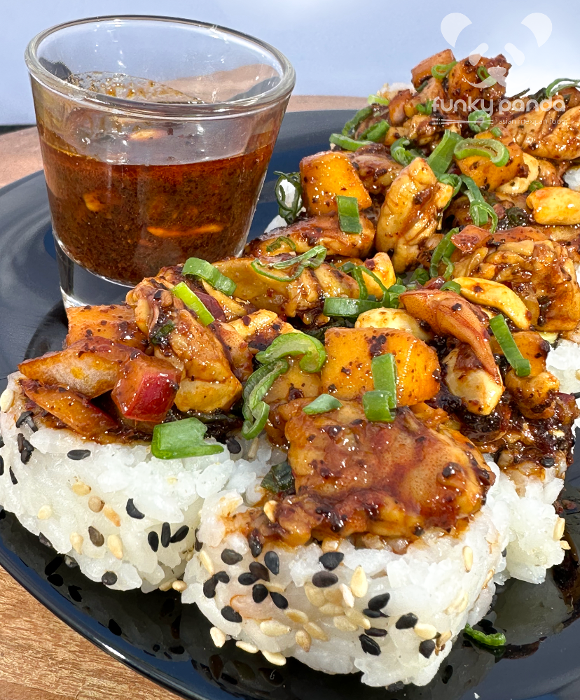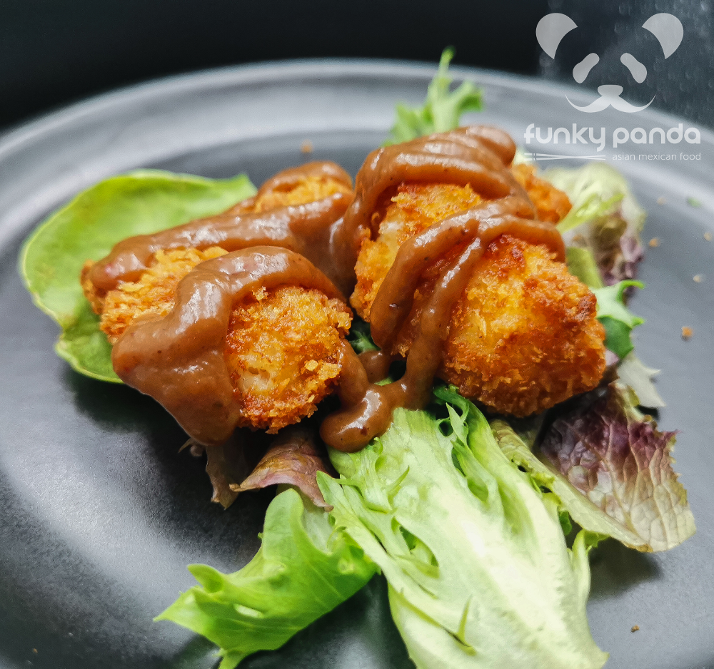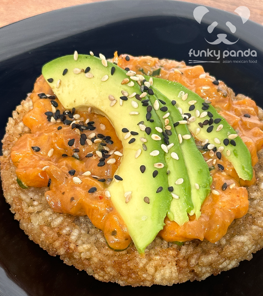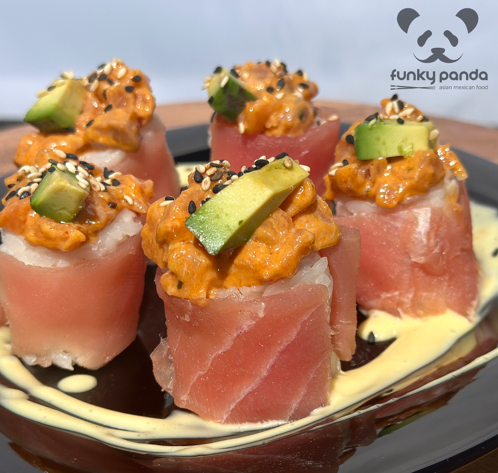 Mimi´s de (salmón o Atún) 3pz, con spicy de la casa, bañadas en salsa de mango